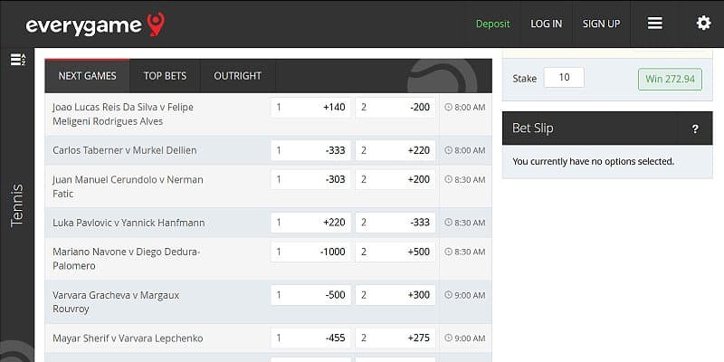 EveryGame: Top choice for live tennis odds, EveryGame’s interface, range of in play betting markets and flexible limits should see it appeal to anyone who wants to bet on tennis matches.