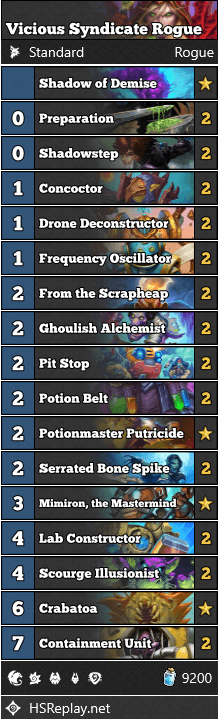 You can't talk about Tempo decks without mentioning Rogue, and this Hearthstone Titans expansion brings us some alternatives. Vicious Syndicate has put this list together with a nice Scourge Illusionist twist. As with every Rogue deck, it has some small Combo potential, allowing you to magnetize Containment Units onto Lab Constructors for a killing effect.