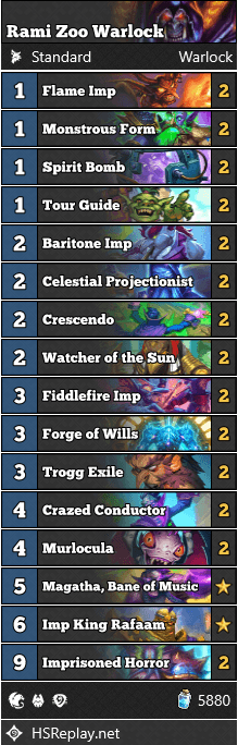 First in line, we have Rami's Zoo Warlock, featuring Imprisoned Horror. Play cards, damage yourself, play more cards, win the game.