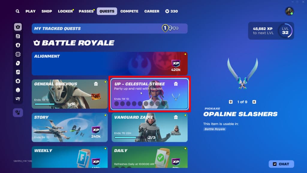 You can begin your journey on the 'Quests' tab under 'Party Up - Celestial Strike.' After clicking on this questline, you will see nine unlockable cosmetics. The final of those in-game items is the Iridia Vayne skin. While this questline began on May 23, today is the first day the skin is available to unlock.