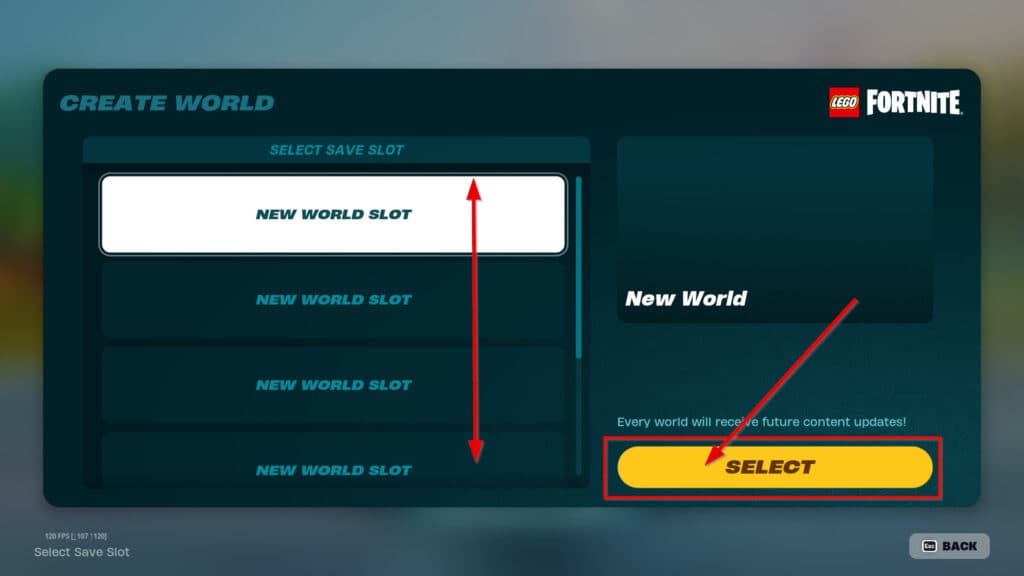 - Choose any empty 'New World Slots' and then click 'Select.'