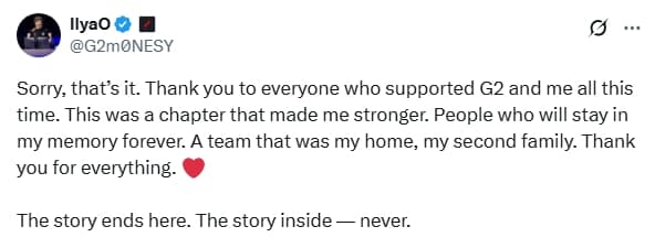 "Sorry, that's it. Thank you to everyone who supported G2 and me all this time. This was a chapter that made me stronger," said m0NESY on Twitter.