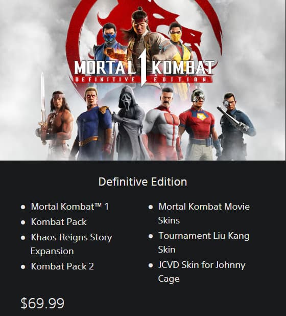 The Definitive Edition features the base Mortal Kombat 1 game, Kombat Packs 1 and 2, the Khaos Reigns and story expansions. Those willing to pay the $69.99 price tag will receive all of the above alongside some recently released cosmetics, including the Mortal Kombat 2 movie skins.